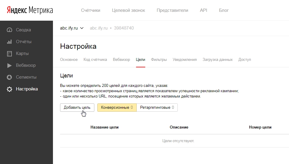 Выбираем пункт "Настройки", потом "Цели" и нажимаем кнопку "Добавить цель".