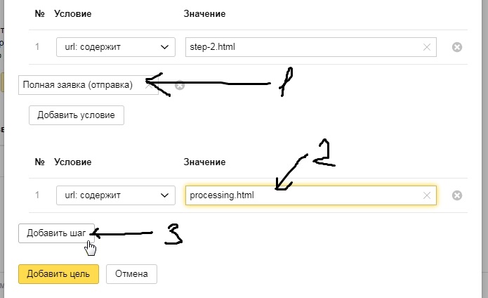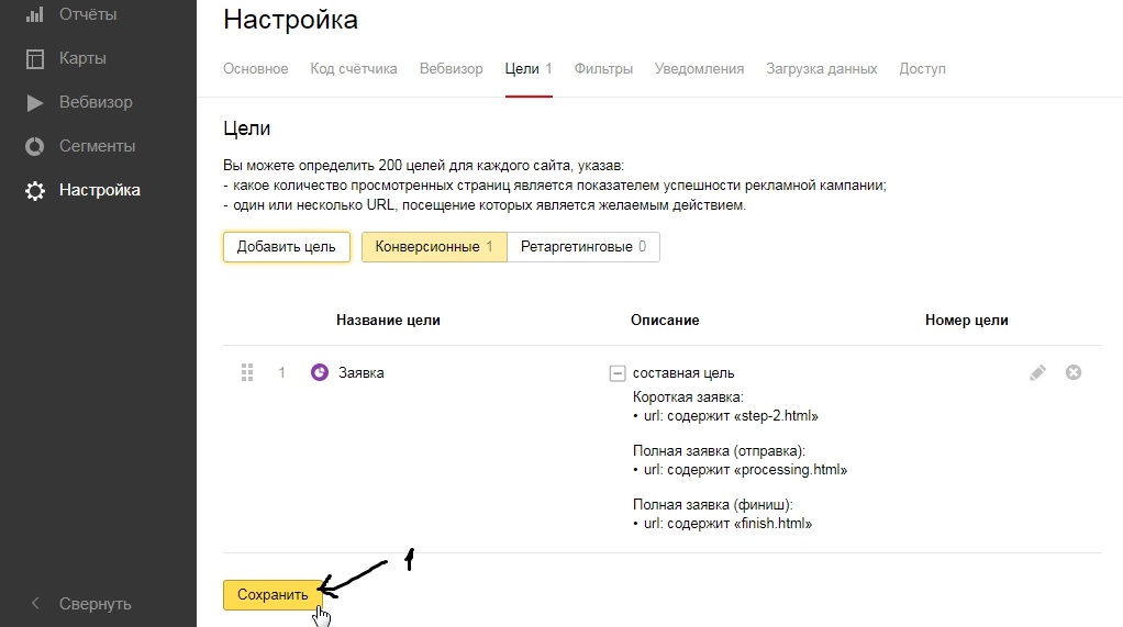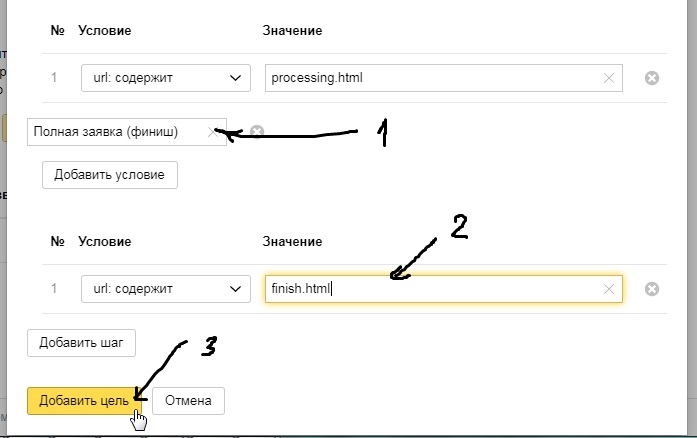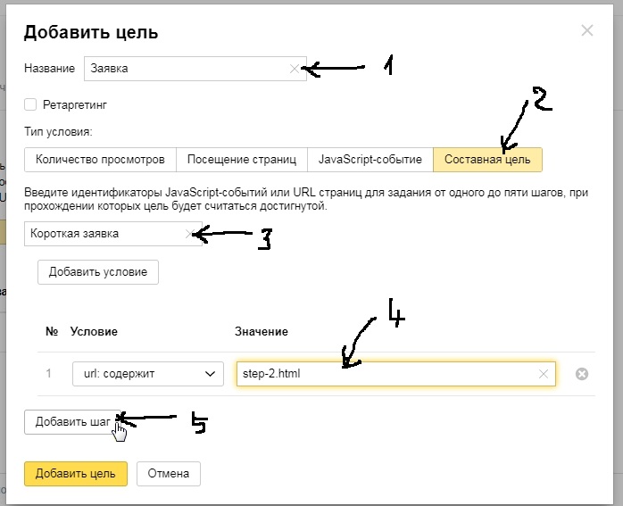 3. "Введите идентификаторы ... которых цель будет считаться достигнутой." вводим - Короткая заявка