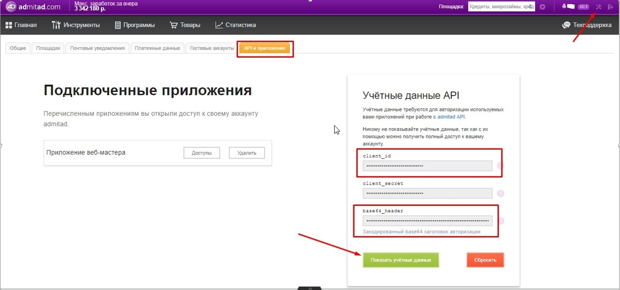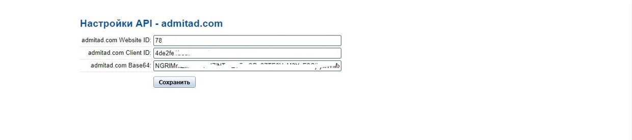 Скопировать base64_header: в кабинете Admitad и вставить в поле admitad.com Base64 раздел Настройки API