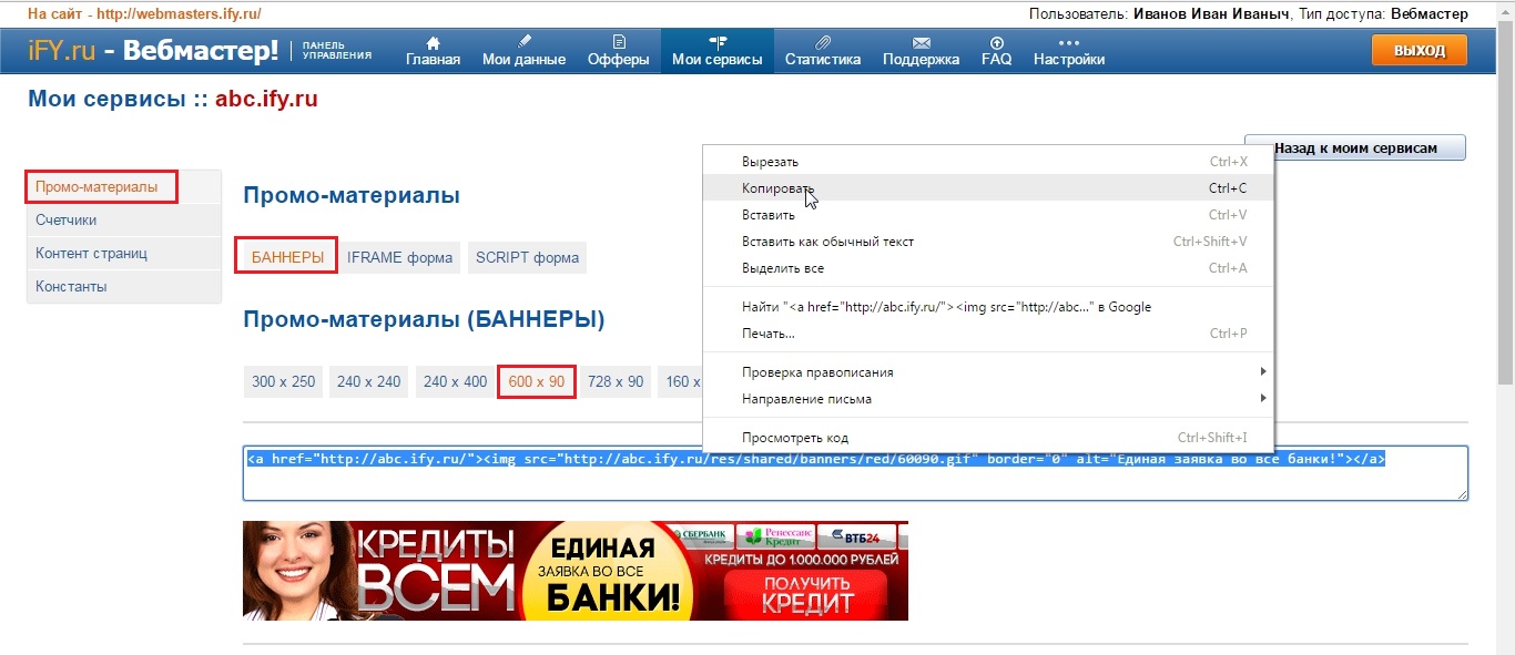 Выбираем размер баннеров и можно скопировать HTML текст ссылки (пример выделено синим) для вставки на другом сайте.