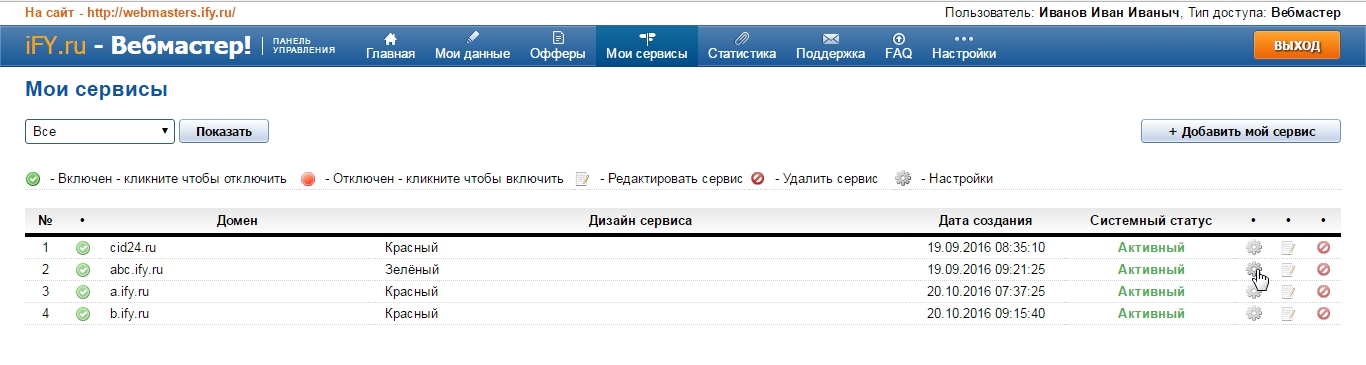 Чтобы изменить тексты, сделать их уникальными для продвижения сервиса в сети, а также прописать ключевые слова и дескрипшен для рабочего проекта нужно перейти в раздел "Сервисы". На нужном сервисе кликните "Настройки".
