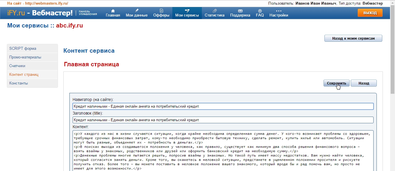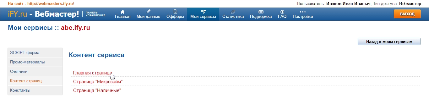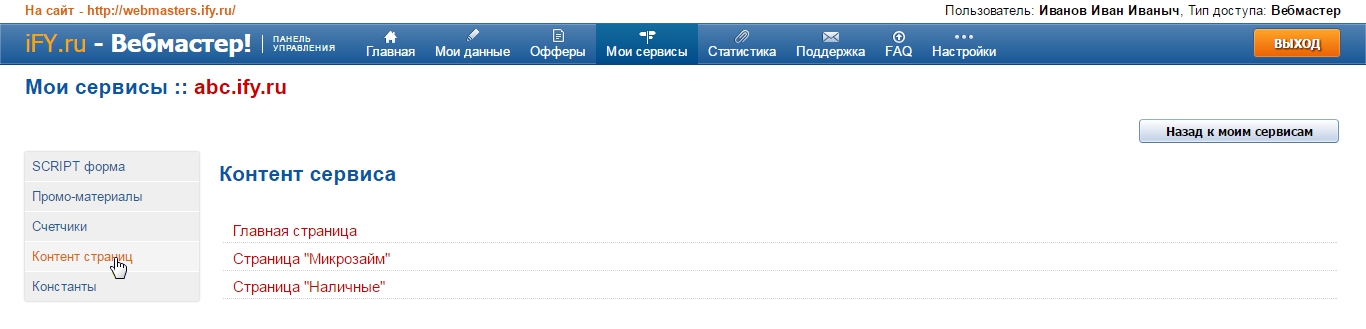 Потом в левом меню выберите раздел "Контент страниц", откроется список страниц для редактирования текстов.